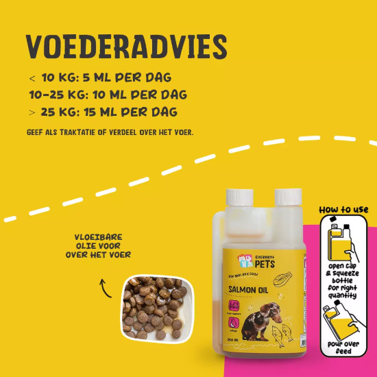 Excellent pets zalmolie kan dagelijks worden toegevoegd aan het voer van je hond: