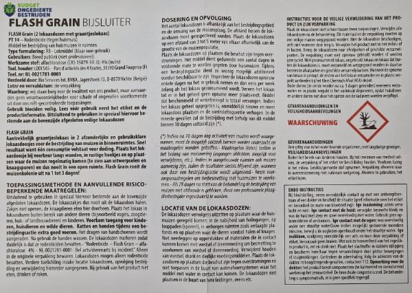 - Effectieve Formule: BSI Flash Graan is gebaseerd op alphachloralose, een krachtig middel dat bekend staat om zijn snelle en effectieve resultaten bij de bestrijding van huismuizen.
