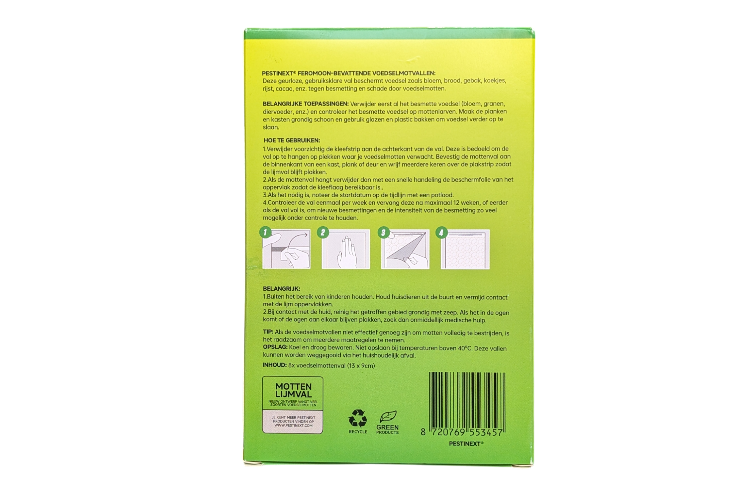 De PestiNext® voedselmottenval is een effectieve, geurloze en gebruiksklare feromoon houdende lijmval die speciaal is ontworpen om voedingsmiddelen zoals meel, brood, gebak, koekjes, rijst en cacao te beschermen tegen vervuiling en bederf veroorzaakt door voedselmotten. Deze val is eenvoudig te installeren op verschillende plekken dankzij de handige kleefstrip aan de achterzijde van de val.
